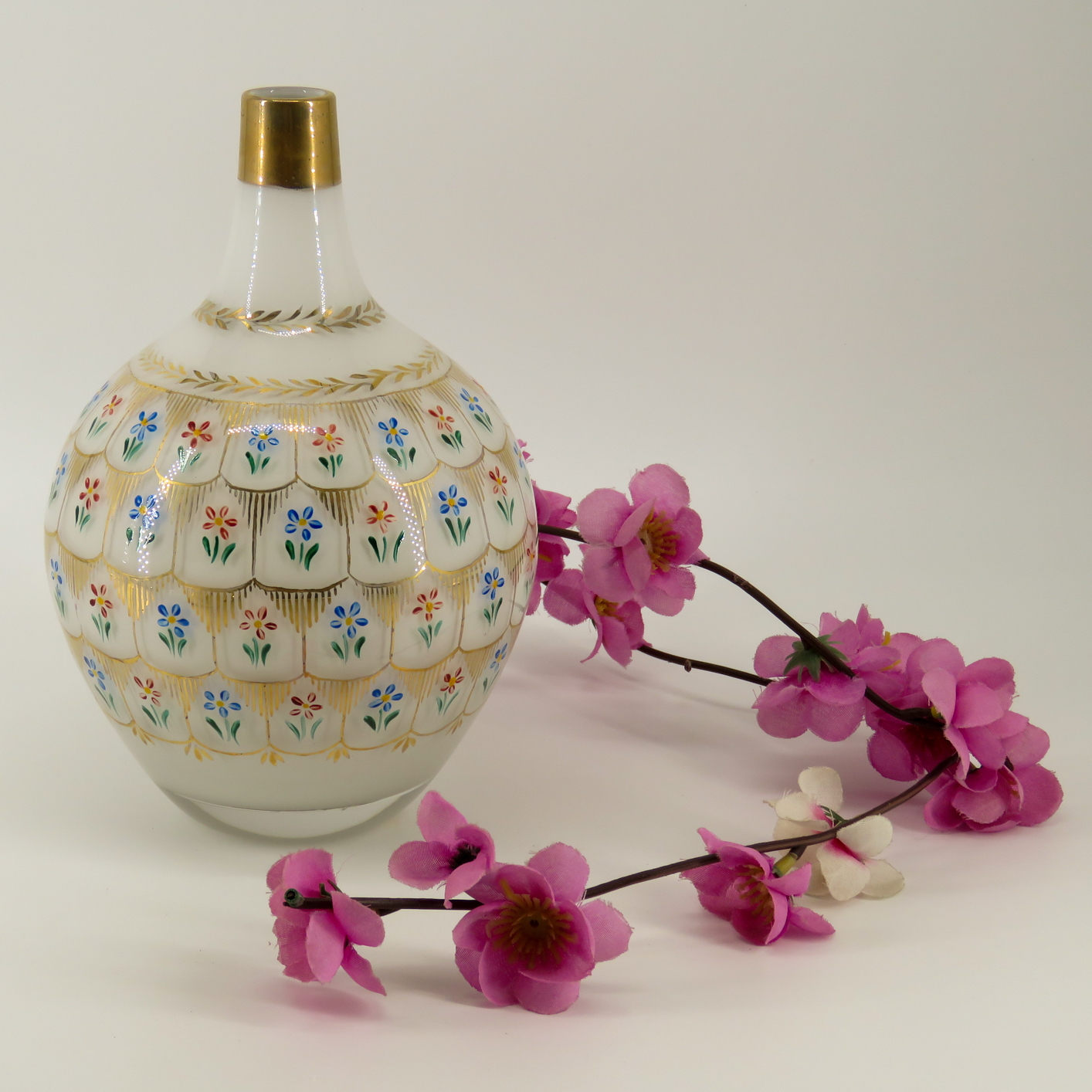 Renkli Detaylar: Şişenin çevresi, her biri el emeği olan renkli emaye cam boyası ile işlenmiş zarif çiçek motifleriyle bezenmiştir.