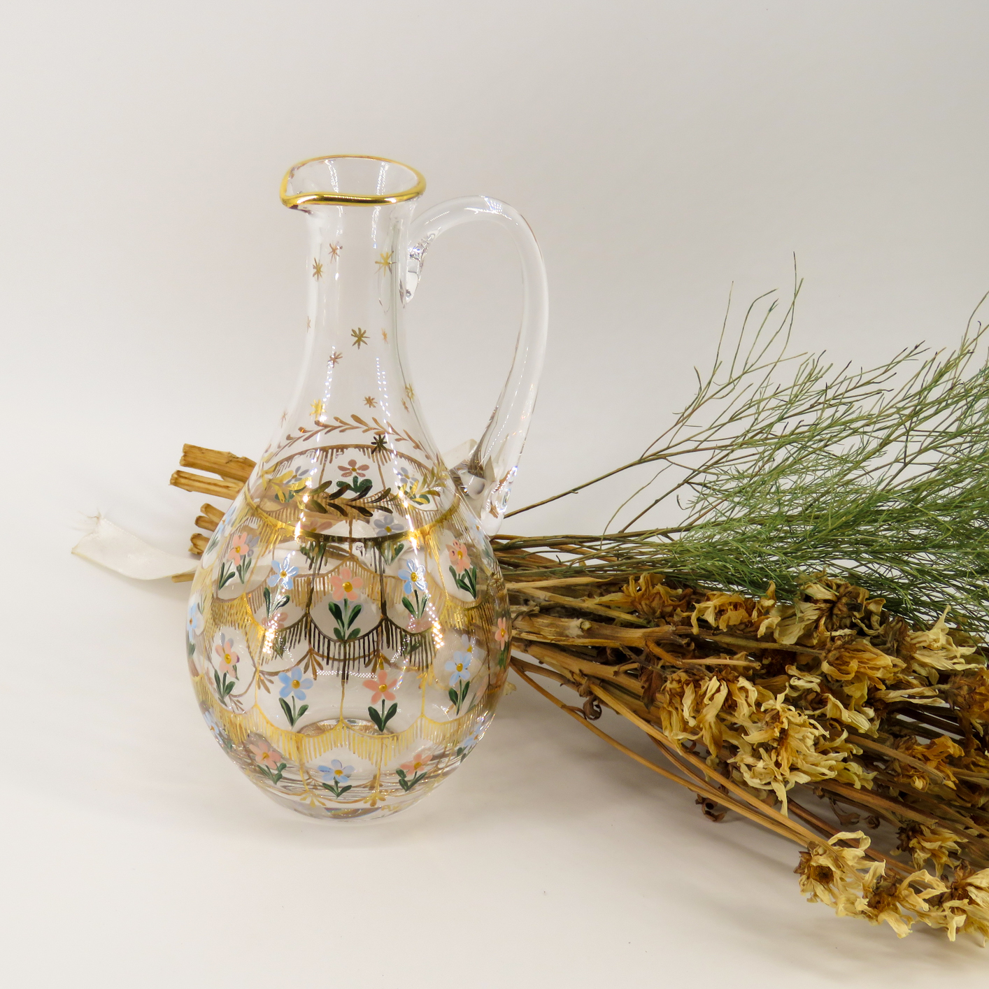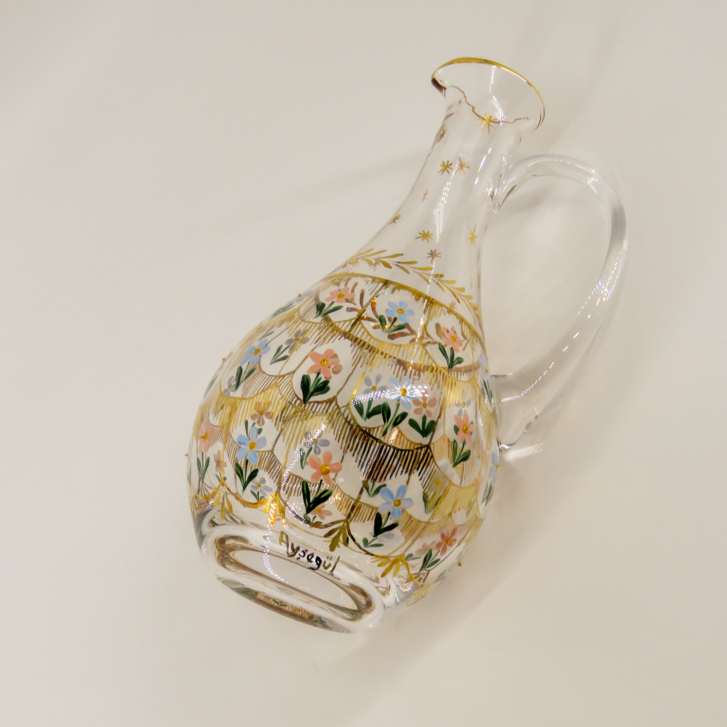 Geleneksel Beykoz Sanatı: Ürün, tarihi Beykoz camcılığının karakteristik özelliklerini yansıtan, el işçiliği ile hazırlanan “altın tığ” ve renkli çiçek desenleriyle bezenmiştir.