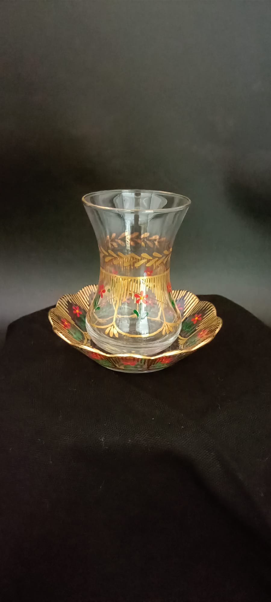 BEYKOZ ÇAY TAKIMI 24 AYAR ALTIN İLE ÇEKİLEN TIĞLARIN ARASI OPAK CAM BOYASIYLA ÇİÇEK MOTİFİYLE BEZENMİŞTİR. 580 DERECEDE FIRINLANMIŞTIR. 6 BARDAK, 6 DİLİMLİ TABAK, 1 TEPSİ VE 1 ŞEKERLİKTEN OLUŞAN TAKIM DİLİMLİ BEYKOZ DESENİYLE SÜSLENMİŞTİR. 24 AYAR ALTIN İLE ÇEKİLEN TIĞLARIN ARASI OPAK CAM BOYASIYLA ÇİÇEK MOTİFİYLE BEZENMİŞTİR. 580 DERECEDE FIRINLANMIŞTIR.
