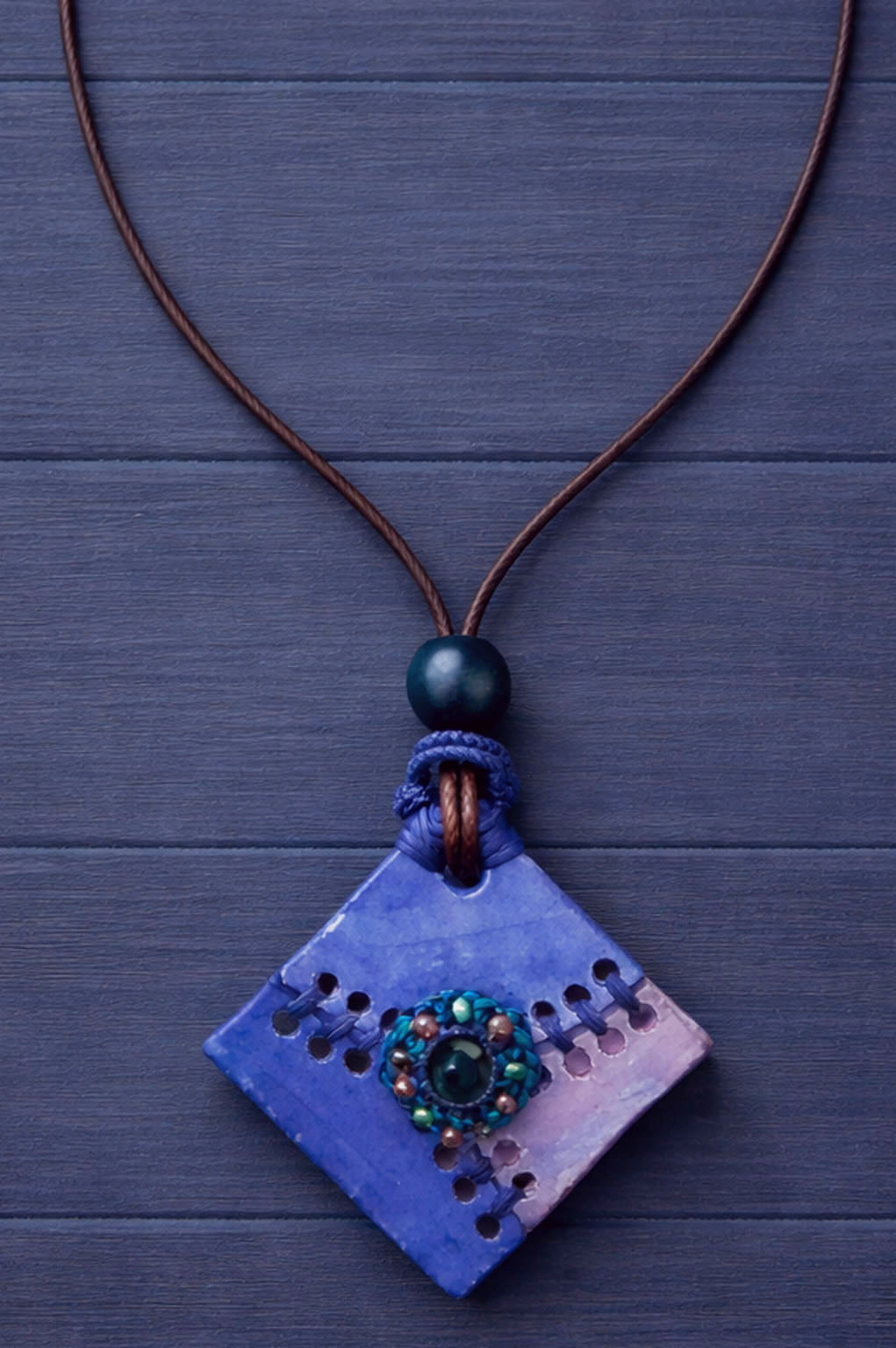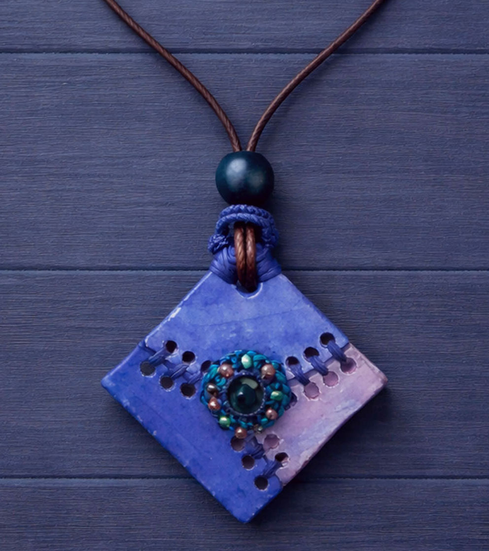 Tamamen el işçiliğiyle üretilmiş, her detayı özenle tasarlanmış, üç ayrı seramik parçanın, farklı renk ve dokularla şekillendirilmesiyle oluşturulmuştur. Seramik yüzeyler, kolyeye derinlik ve karakter kazandırırken; parçalar el işi bağlama teknikleri ve boncuk detayları ile bir araya getirilmiştir.