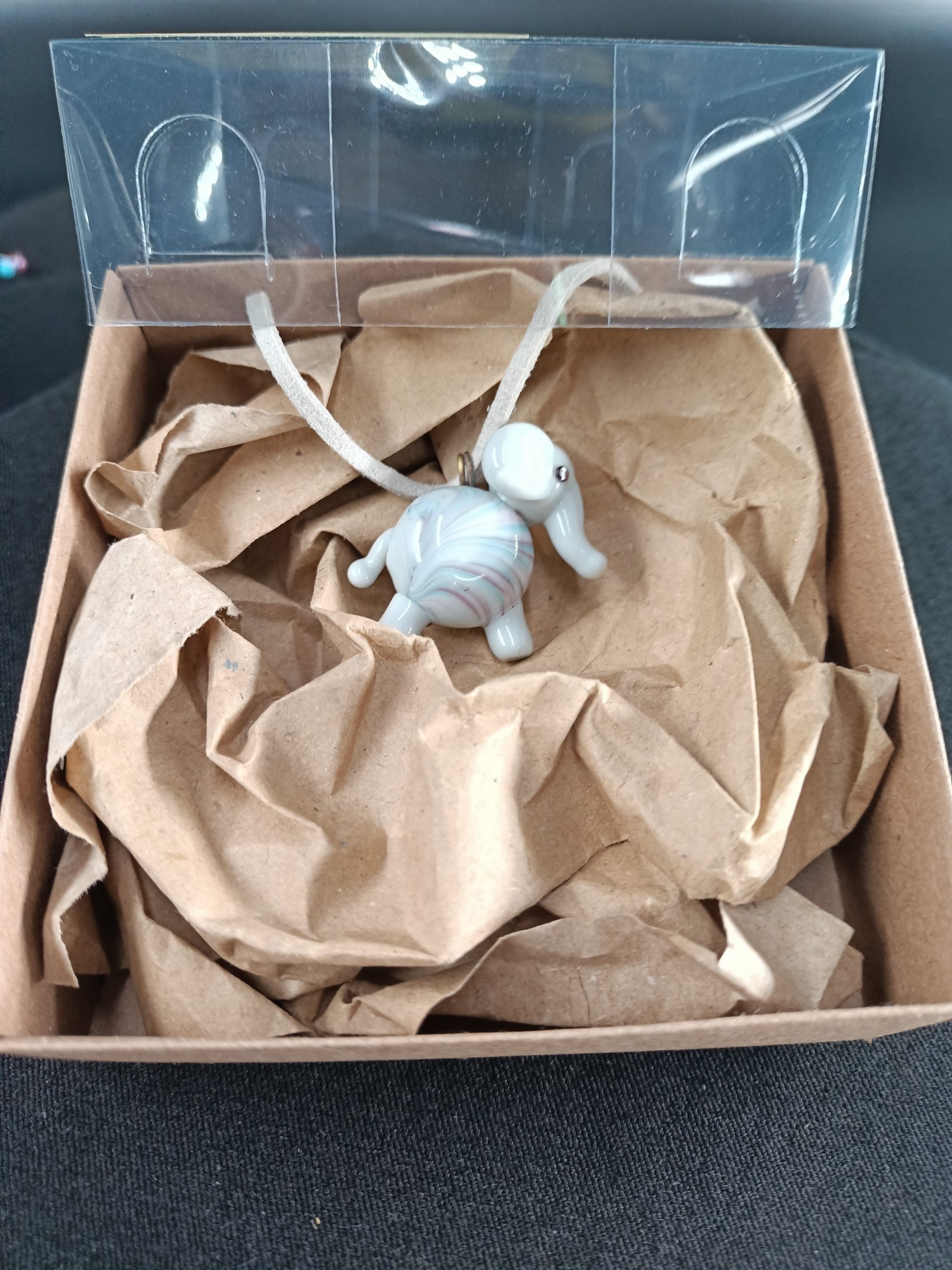 Bu özel tasarım kolye, cam sanatında şaloma (alev) tekniği kullanılarak üretilmiştir. Cam, yaklaşık 1000–1200 derece sıcaklıktaki alevde aşama aşama ısıtılarak eritilir ve tamamen el işçiliğiyle şekillendirilir.