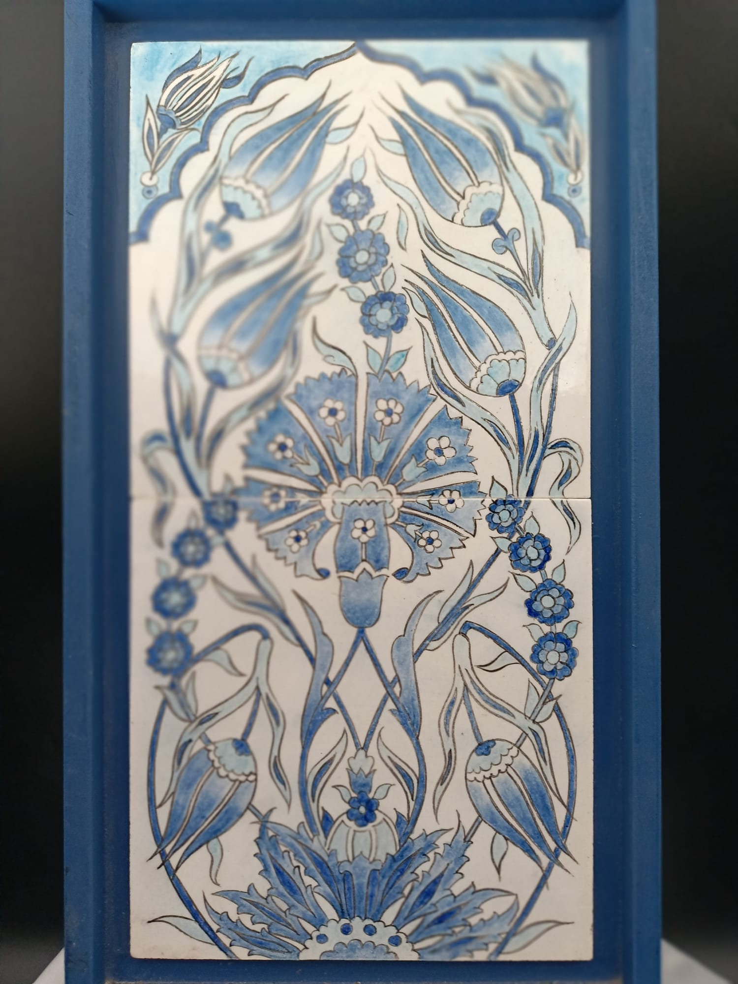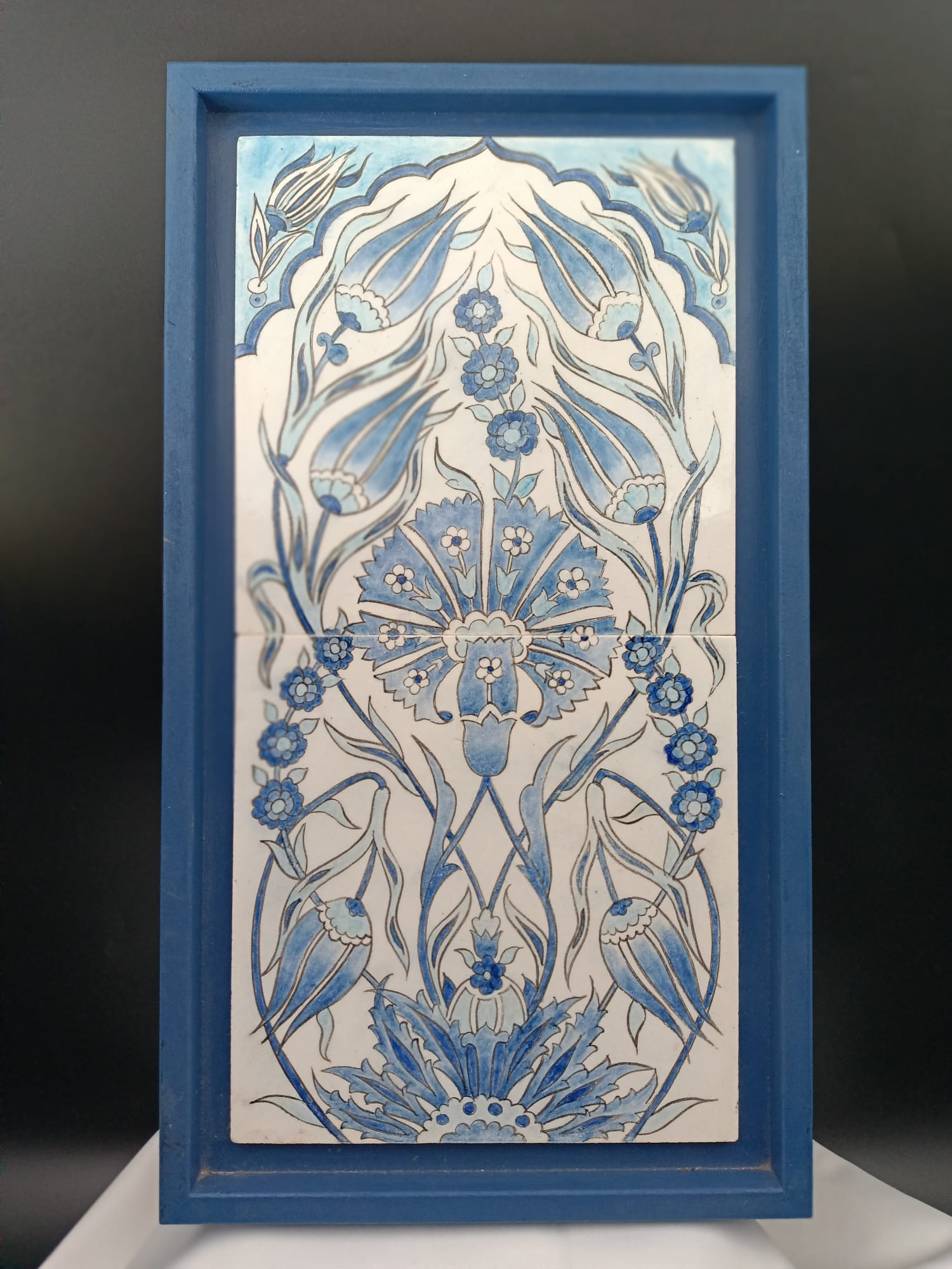 Bu şık Geleneksel Çini Pano, Osmanlı saray sanatının en nadide çiçek motifi karakteristik mavi-beyaz (Mavi-Sefid) geleneğine sadık kalınarak hazırlanır.