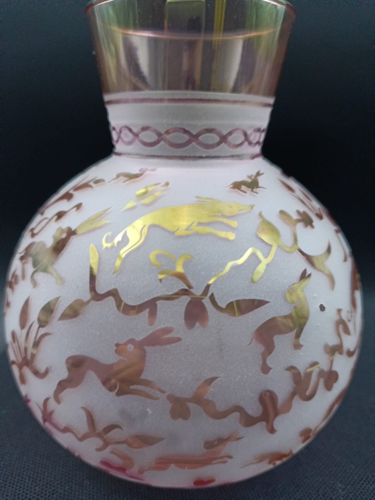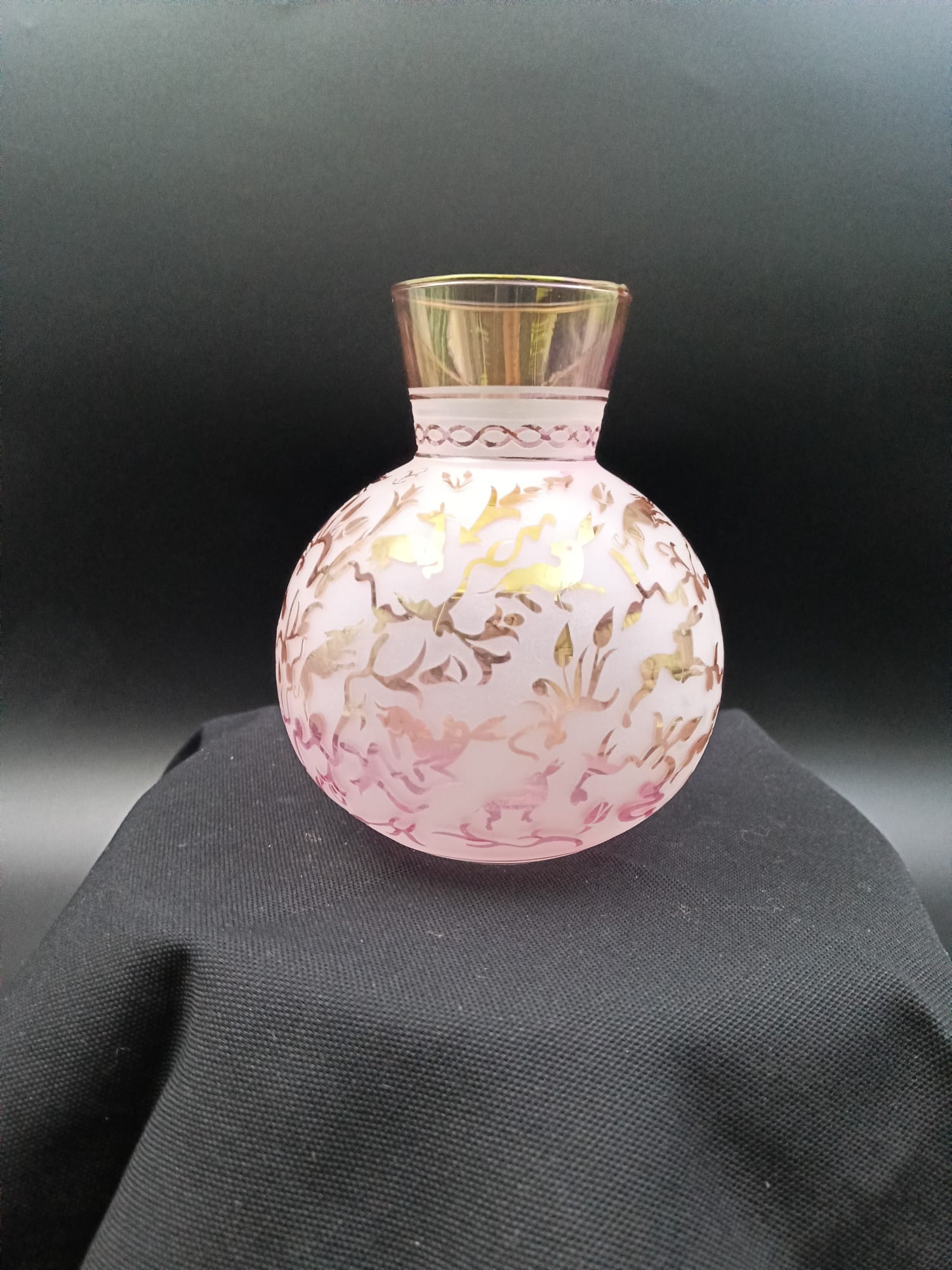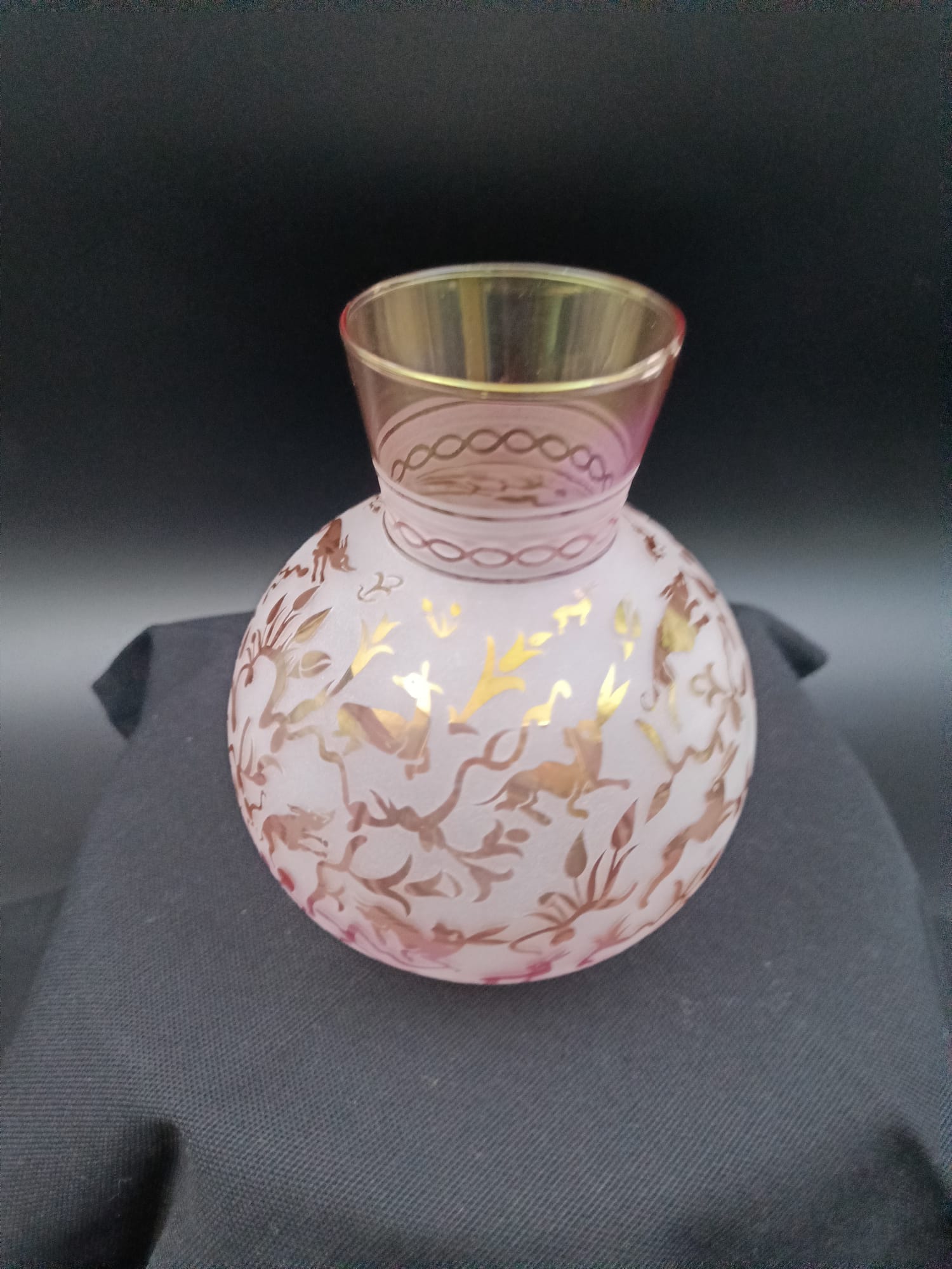 Bu özel tasarım küre vazo, geleneksel cam işleme sanatının modern bir yorumudur. Pembe lustral boyanın kattığı ışıltı ve kumlama tekniğiyle oluşturulan klasik desenler, dekorasyonunuza sofistike bir dokunuş katar.