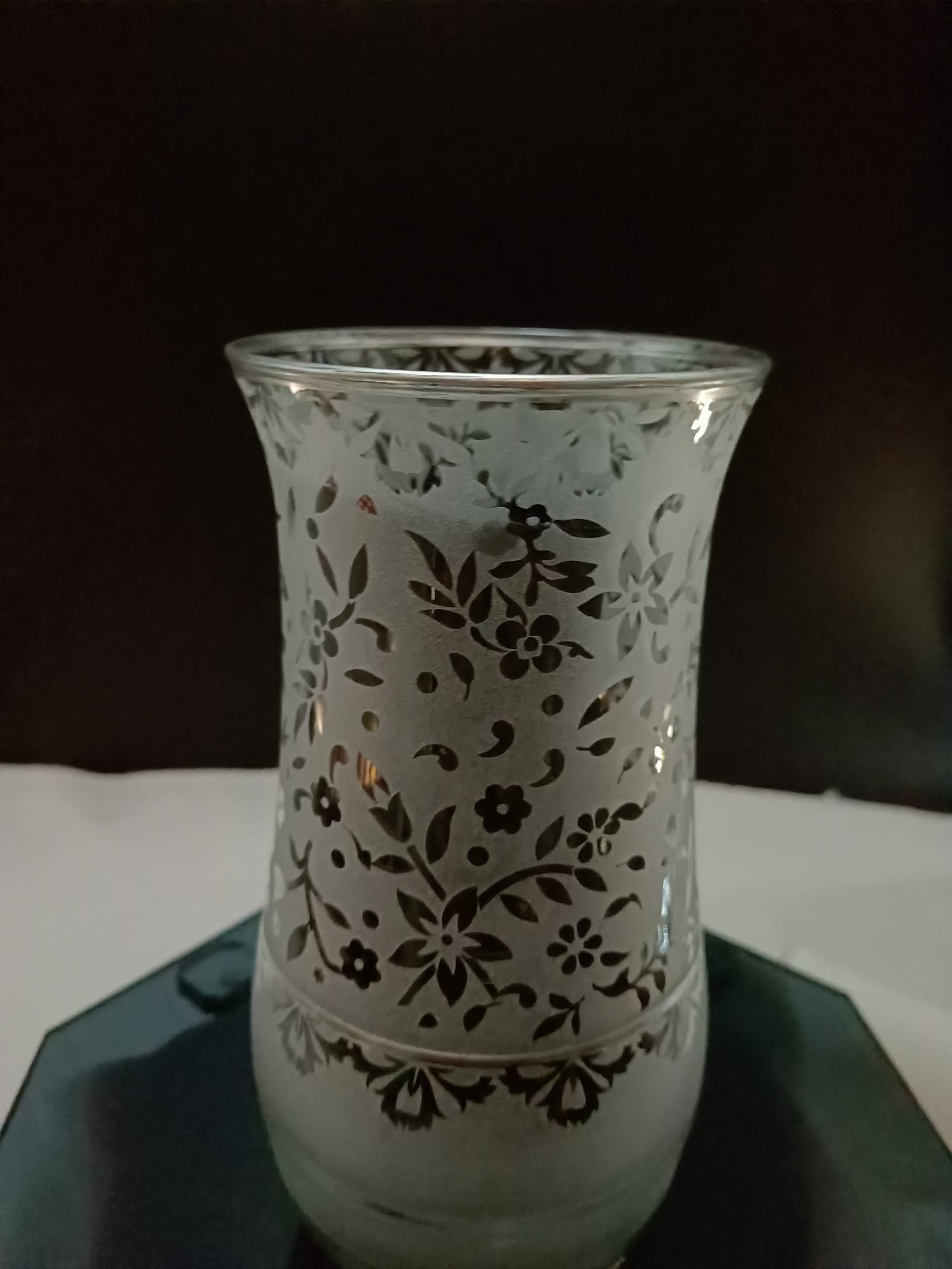 • Kumlama Sanatı: Vazo üzerindeki narin çiçek ve yaprak motifleri, camın yüzeyine profesyonel kumlama (sandblasting) tekniği ile işlenmiştir. Bu işlem, cama ipeksi bir matlık ve dokunma hissi uyandıran bir derinlik kazandırır.