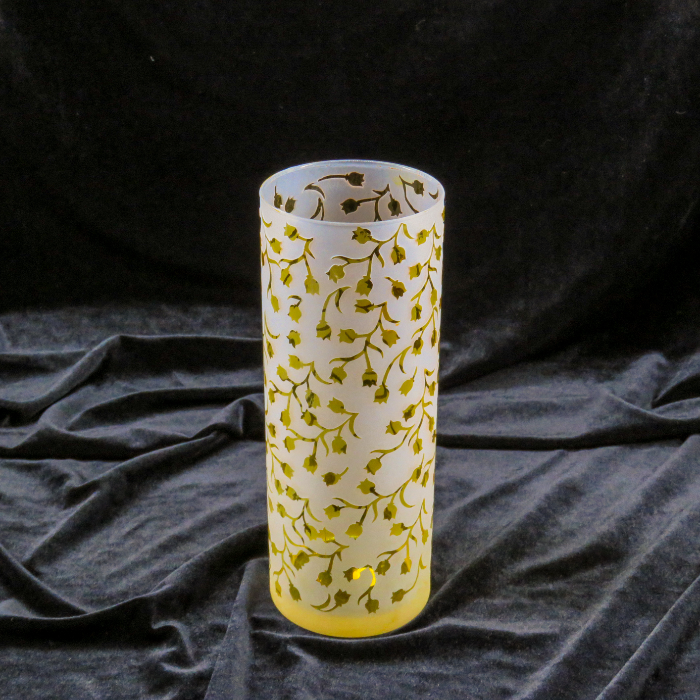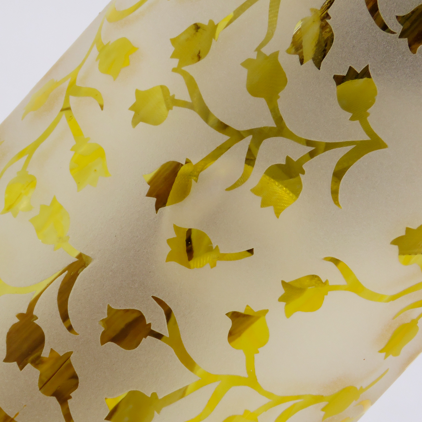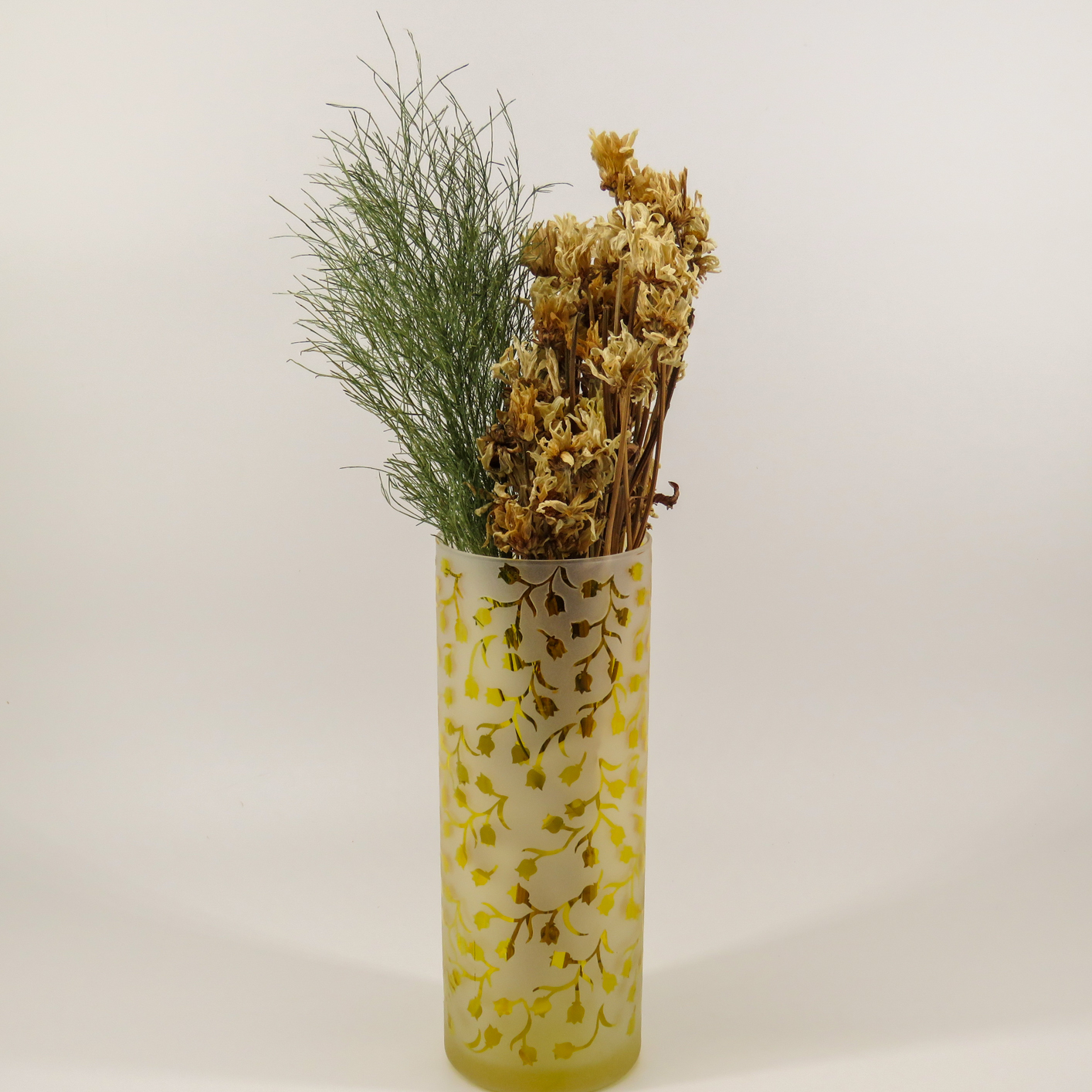 Kumlama ile Özel Desen Tasarımı: Fırınlama işleminin ardından, vazonun üzerine özel olarak tasarlanan bitkisel desenler aktarılmıştır. Kumlama (sandblasting) tekniği ile elde edilen bu motifler, parlak sarı zemin üzerinde mat bir doku yaratarak şık bir kontrast oluşturur.