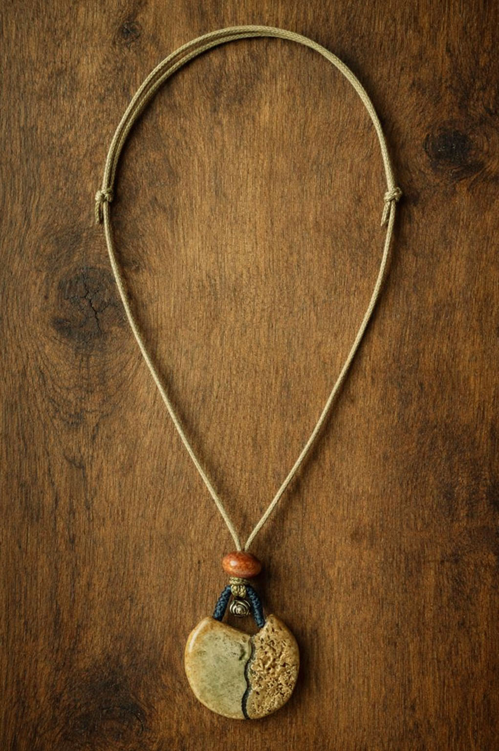 Bu kolyenin ucu, tamamen elle şekillendirilmiş seramikten üretilmiştir. Yüzeyinde yer alan toprak, kum ve açık bej tonları, doğadan ilham alan doğal bir renk geçişi sunar. Seramiğin bir yüzeyi daha pürüzsüz ve sakin, diğer yüzeyi ise bilinçli aşındırmalarla dokulandırılmıştır. Bu kontrast, kolyeye hem görsel derinlik hem de özgün bir karakter kazandırır.