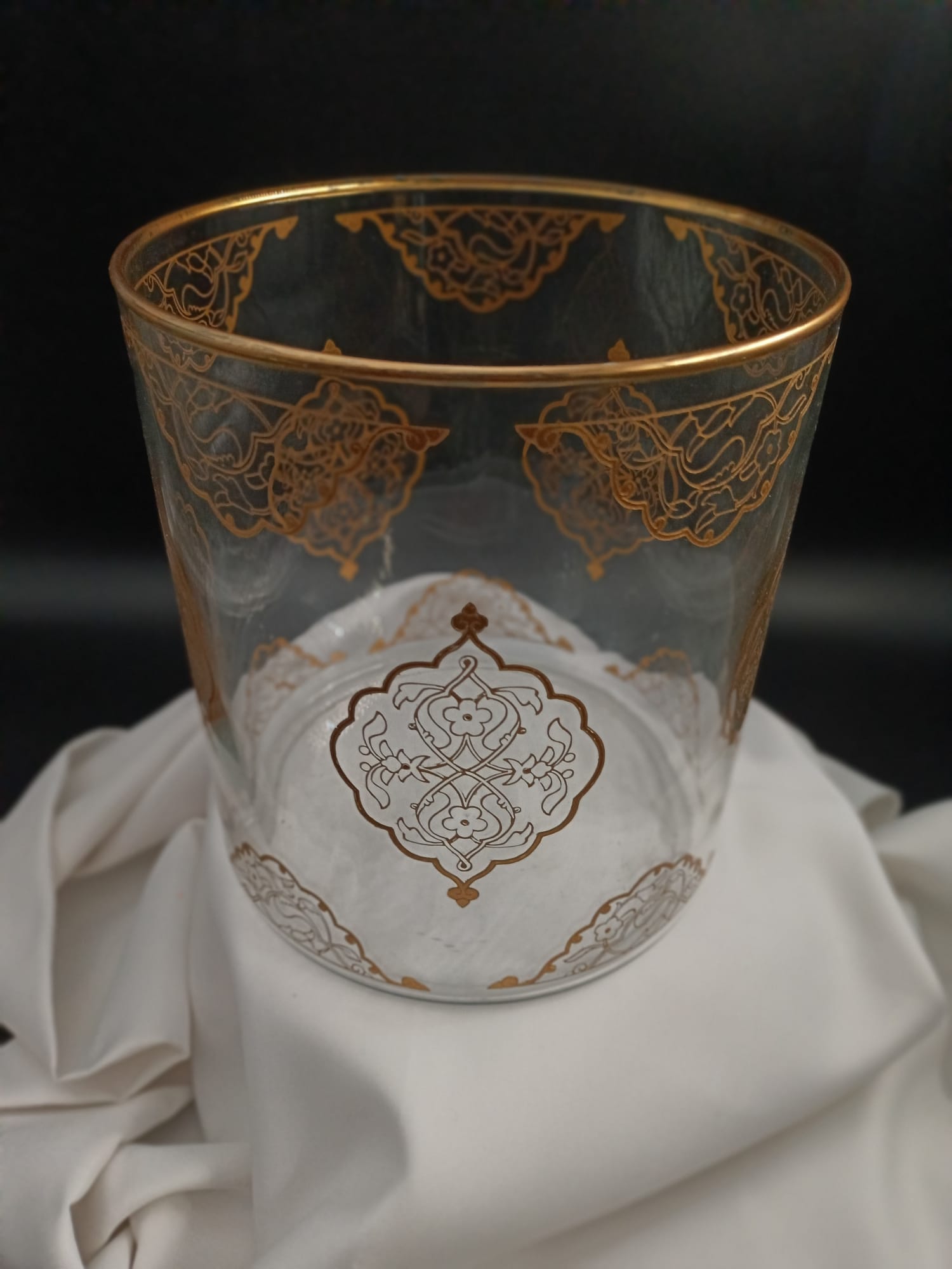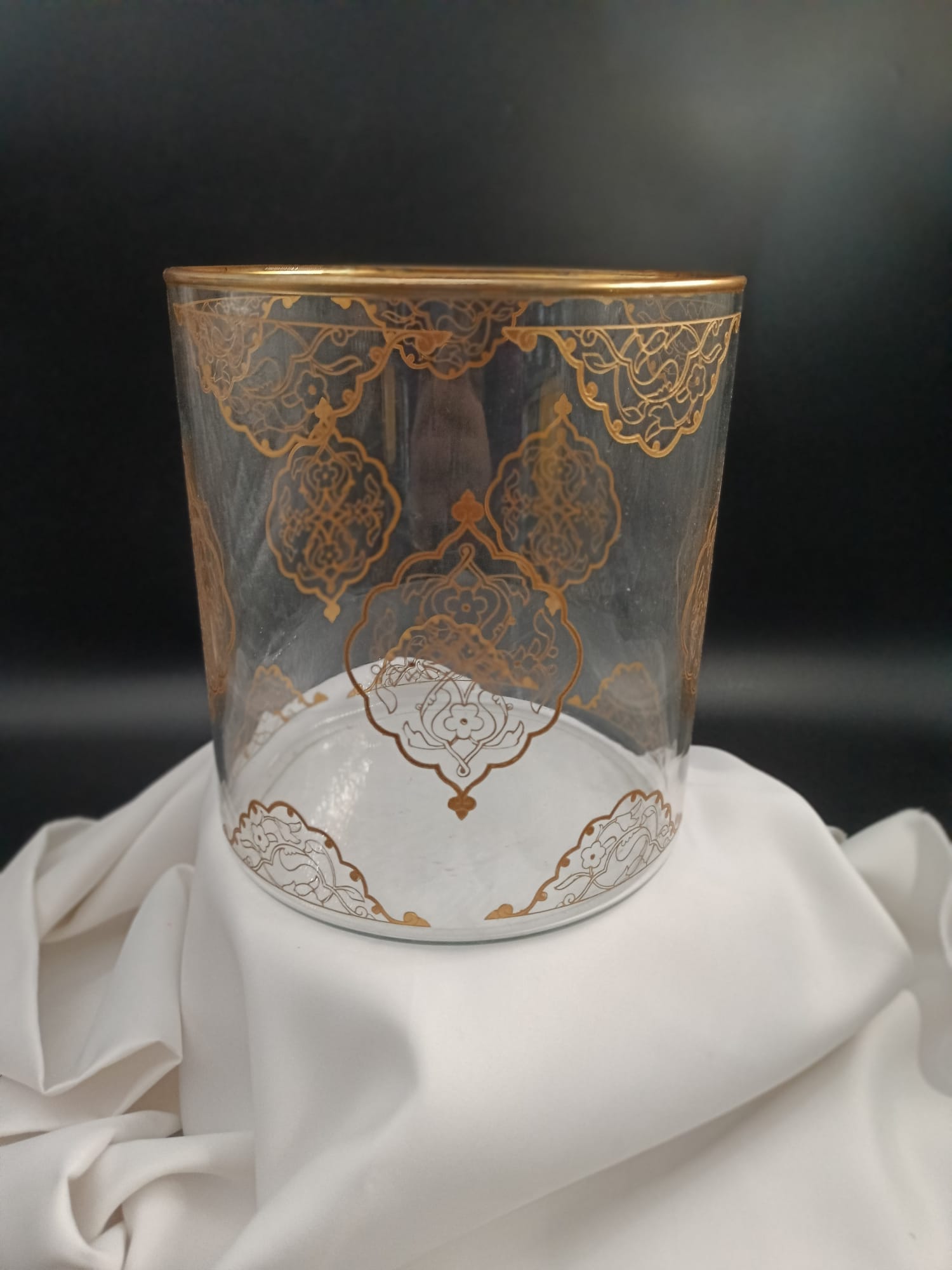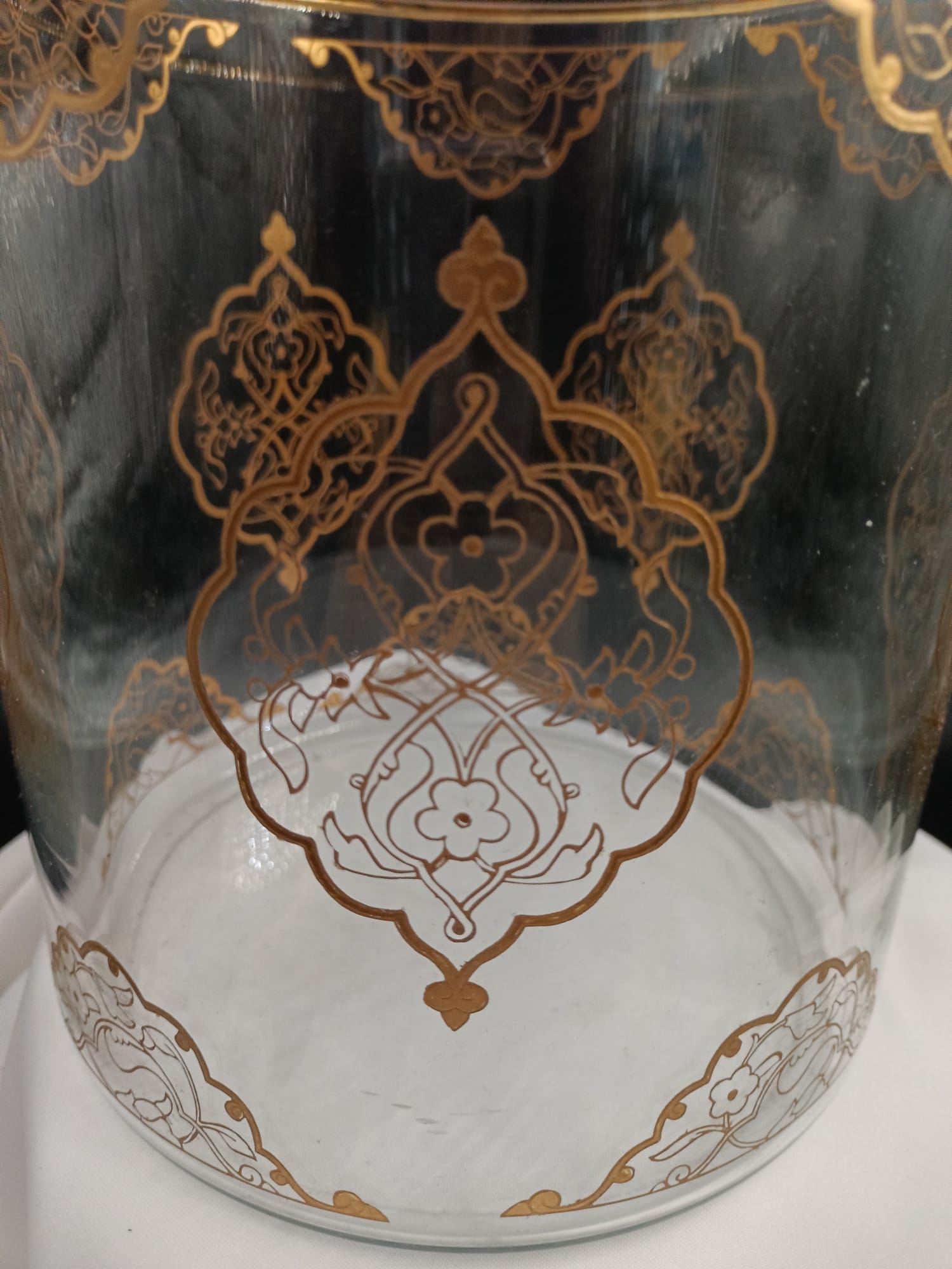 Zanaat ve Uygulama: Tasarımı özel olarak hazırlanan cam objenin yüzeyine ilk aşamada kumlama tekniği uygulanarak yarı mat ve dokulu bir zemin oluşturulmuştur. Bu zemin üzerine, geleneksel şemse ve rumi formlarını anımsatan tezhip motifleri altın yaldızla büyük bir titizlikle işlenmiştir.