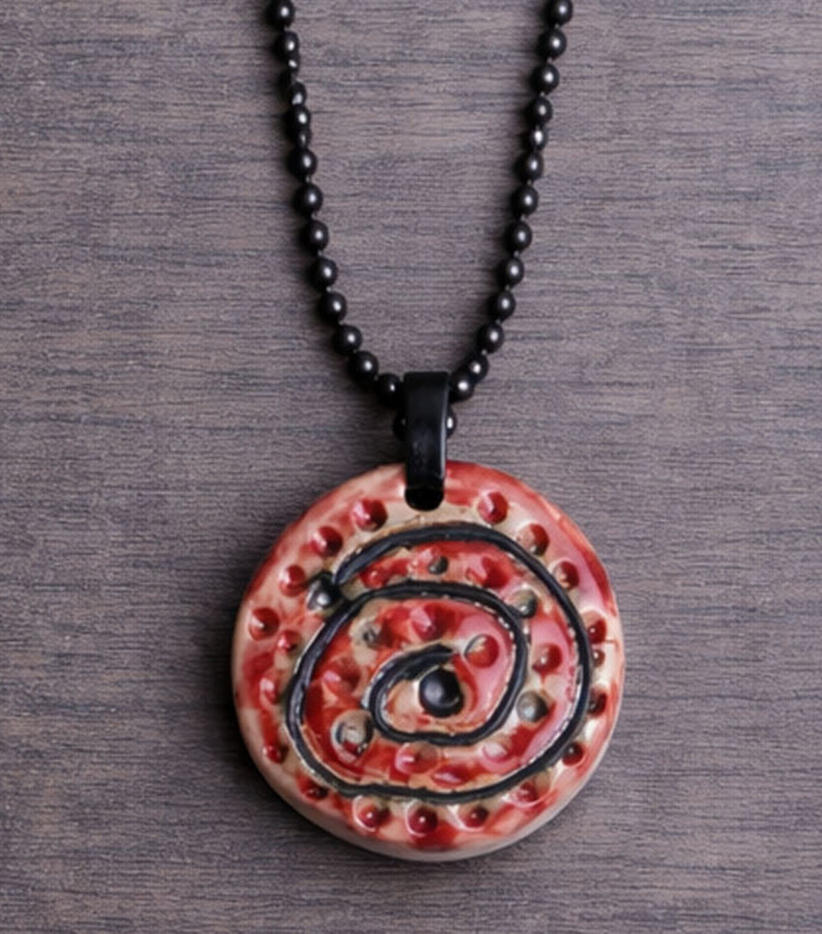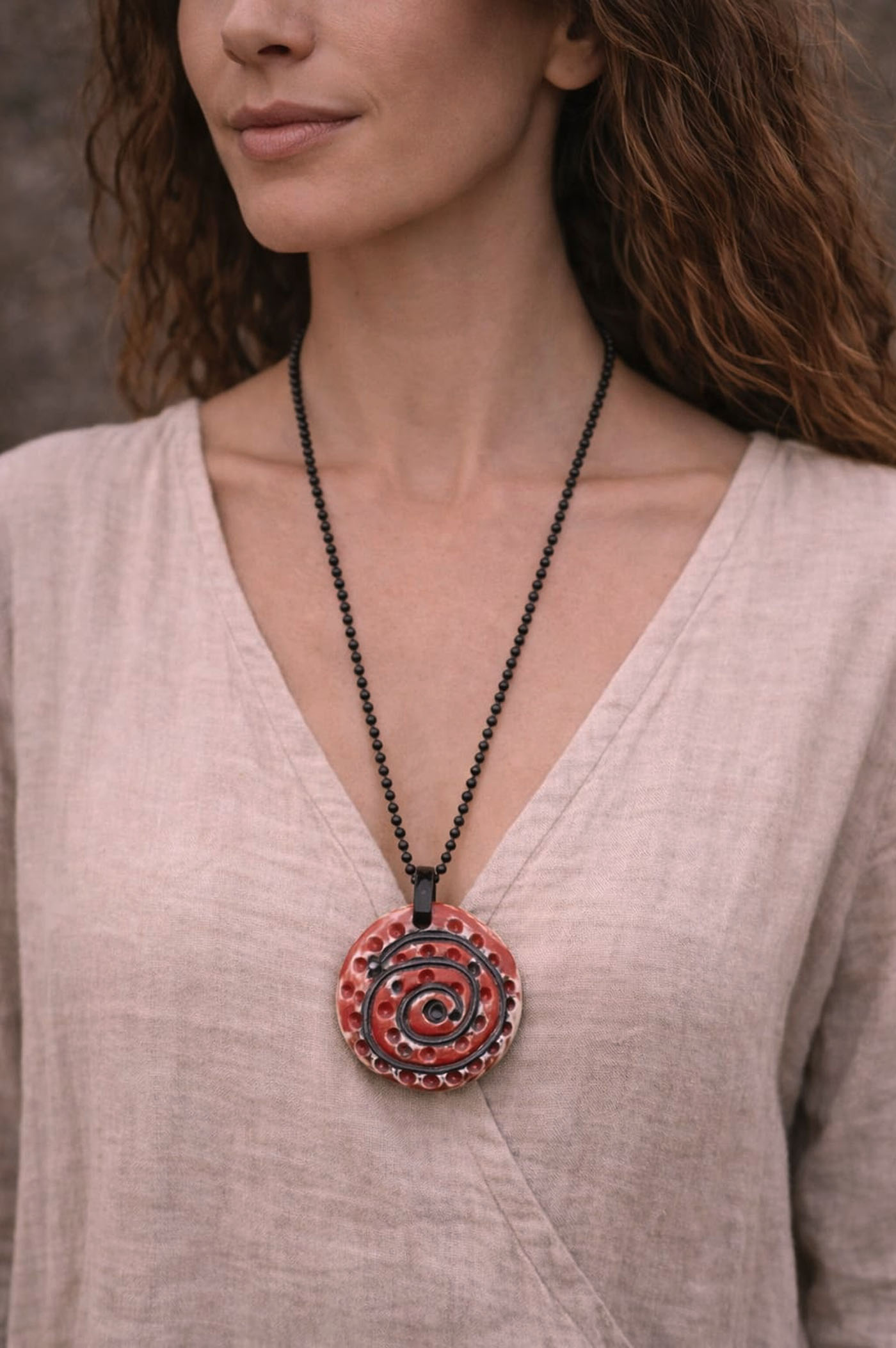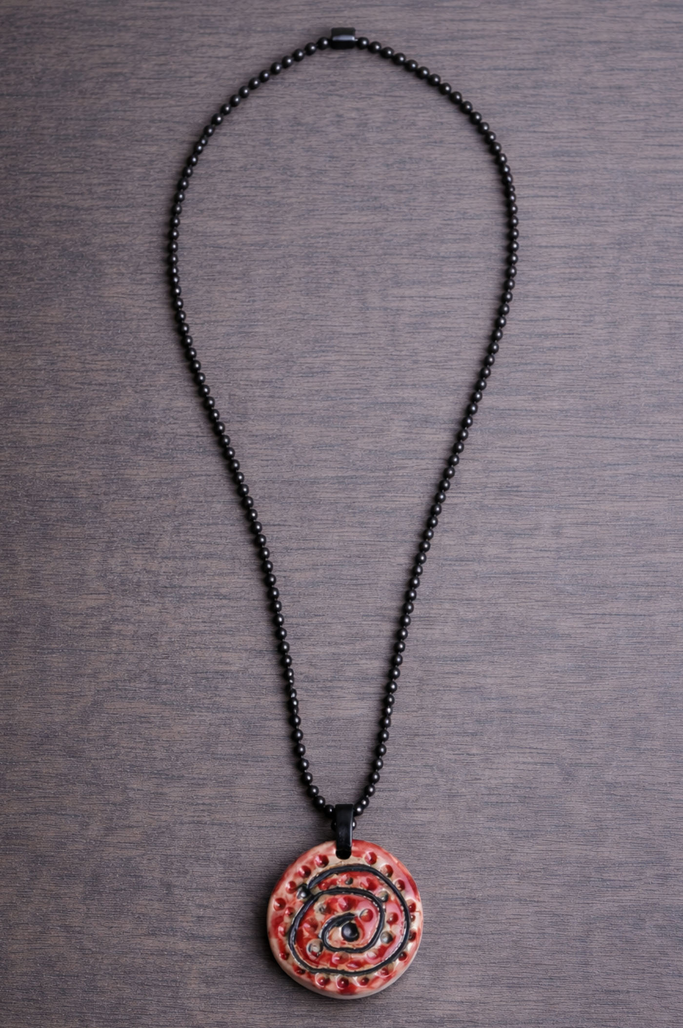 Bu kolyenin ucu, tamamen elle şekillendirilmiş seramikten üretilmiştir. Yüzeyinde kullanılan kırmızı, krem ve kızıl tonlar, seramiğin doğal dokusuyla birleşerek sıcak ve dengeli bir görünüm sunar. Spiral formdaki metal seramikle pişerek bütünleşmiş, küçük kabartmalar, noktasal dokular, el işçiliğinin izlerini ve tasarımın özgün karakterini yansıtır. Kolyenin askısı, siyah çelik bazlı zincirin sade ve güçlü yapısı, seramik ucun doğal formunu ön plana çıkarır.