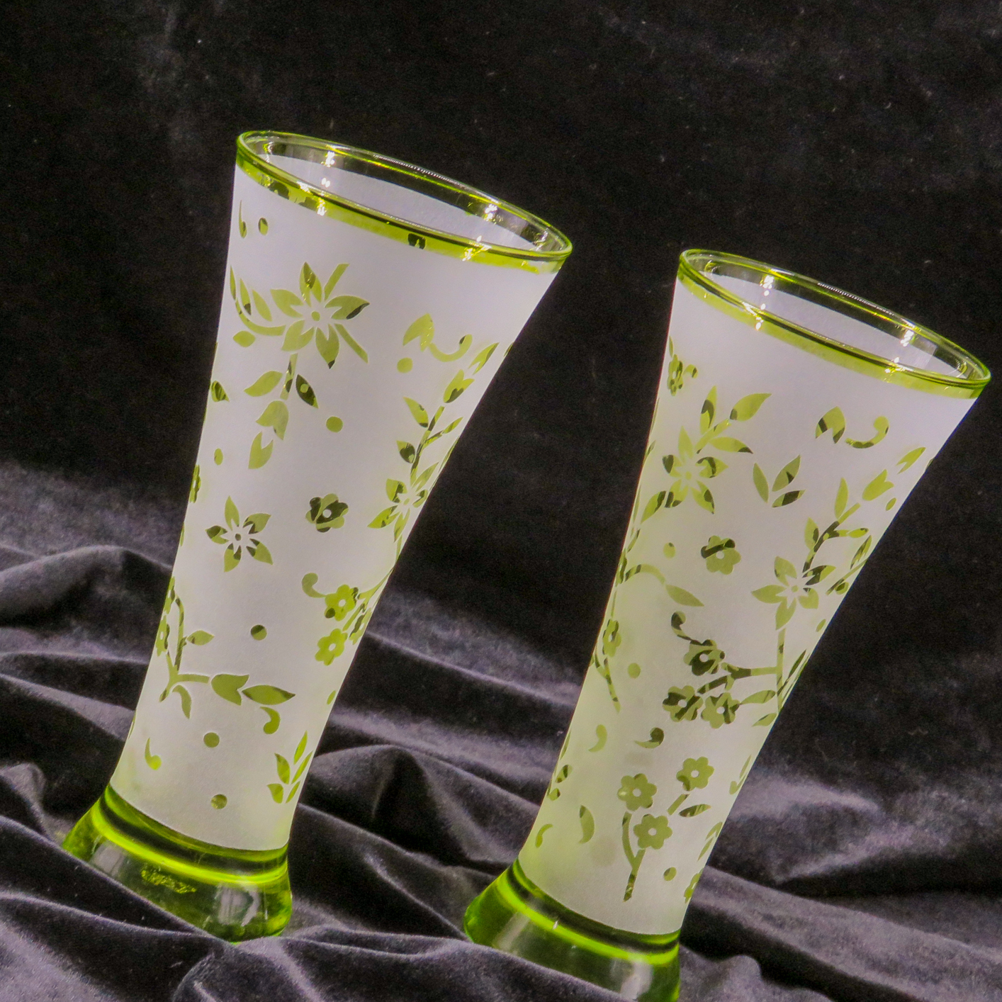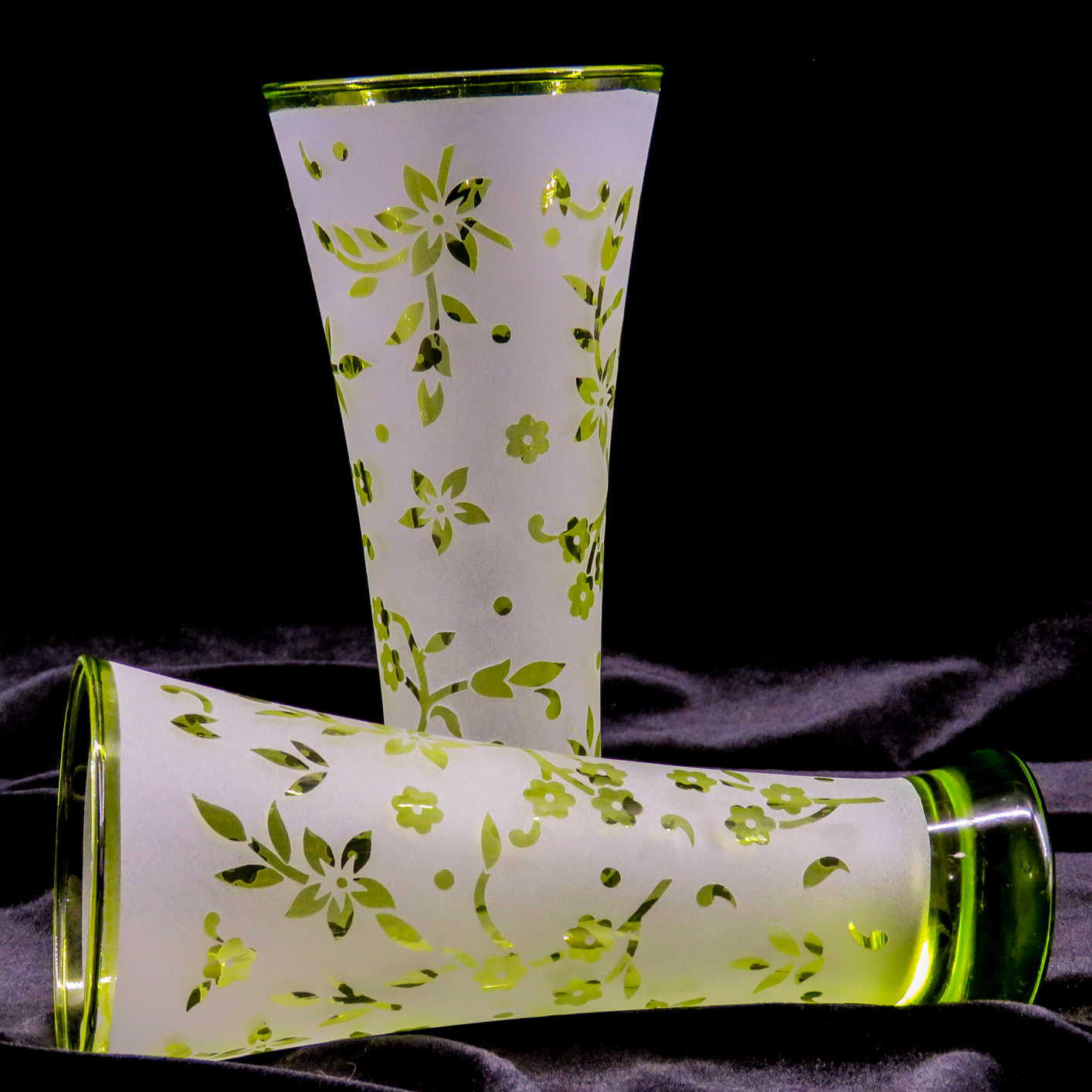 Kumlama ile Desen Tasarımı: Fırınlama sonrası, vazoların üzerine özel tasarlanmış floral motifler işlenmiştir. Kumlama (sandblasting) tekniği ile elde edilen bu desenler, parlak yeşil zemin üzerinde mat bir doku yaratarak görsel bir kontrast oluşturur.
