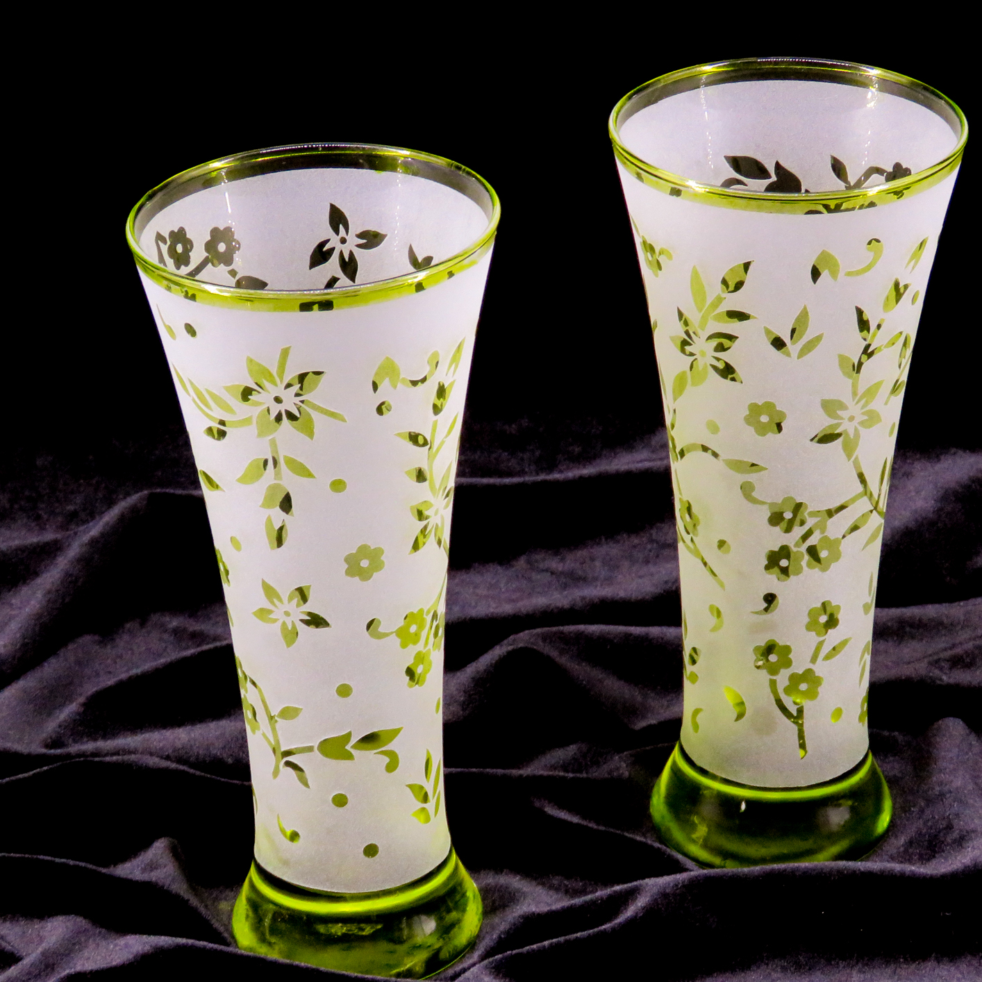 Lüster Boya Tekniği: Vazoların dış yüzeyi, cama karakteristik bir parlaklık ve derinlik veren özel yeşil lüster boya ile tamamen kaplanmıştır.